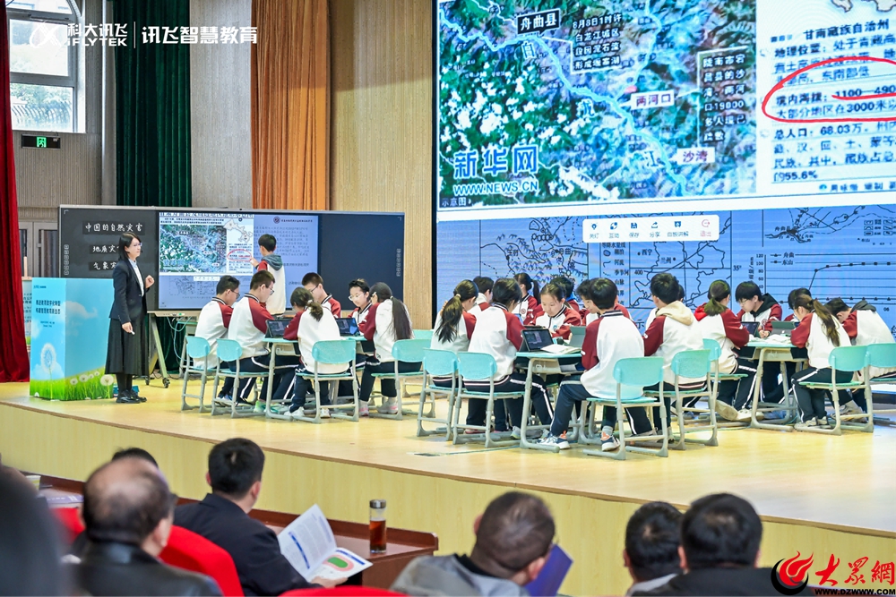 活动尾声,学校带来了一堂地理学科的AIGC融合公开课,呈现智能技术与课堂教学的深度融合。随后,高级教师、青岛西海岸新区教育和体育科学研究院智慧教育指导中心负责人任萌作《人工智能深度赋能区域教育高质量发展》主题汇报。任萌指出,自2019年启动“因材施教”人工智能+教育创新应用项目,新区已逐步构建起覆盖环境、资源、治理、素养与教学创新的“五化”智慧生态,培育出双语小学、奋进路中学等一批示范校。面向未来,新区将以三年行动计划为蓝图,重点推进六大专项行动,着力在教师数字素养提升、个性化学习生态构建、数智教育环境升级、协同育人体系完善等关键领域实现新突破,加快推进教育数字化转型。